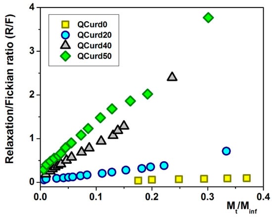 Using Equations (14) and (15), the ratio between the relaxation contribution (R) and diffusional contribution (F) was calculated during the release of DCF and presented in Figure 7. For the QCurd0 sample, the R/F ratio < 1 confirms that the DCF release was governed by Fickian diffusion, while even small amounts of QCurd in the hydrogel cause the R/F ratio to increase above 1. In this case, the release of the drug was controlled by the relaxation of the polymer chains in the beginning, followed by the diffusion process of DCF.