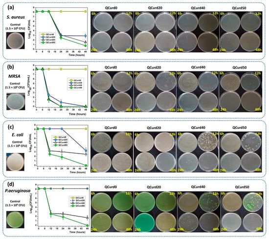 Antimicrobial activity of QCurd/Curd hydrogels against S. aureus (a), MRSA (b), E. coli (c), and P. aeruginosa (d) after 6, 12, 24, and 48 h of incubation.