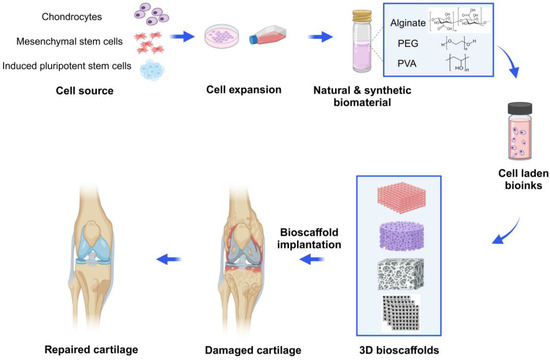 Schematic diagram of 3D bioprinted hydrogel for articular cartilage tissue engineering. Chondrocytes, mesenchymal stem cells (MSCs) or chondroprogenitor cells are isolated, cultured and expanded with the growth medium. Then, the cells are incorporated with natural hydrogels (e.g., alginate) or synthetic hydrogels (e.g., PEG or PVA) and create various 3D-printed bioscaffolds using the commonly used bioprinting strategies in tissue engineering. Then, according to specific circumstances and needs, the bioscaffolds are transplanted into the damaged cartilage, enabling articular cartilage to repair and regenerate. Created with BioRender.com.