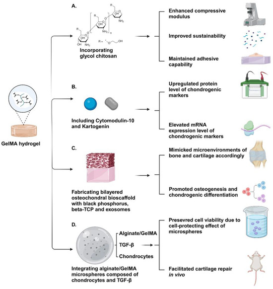 Schematic illustration of GelMA-based hydrogels. (A) The GelMA–glycol chitosan hydrogel exhibited excellent mechanical properties and an appropriate degradation period while maintaining high adhesive capability. (B) The increased expression of chondrogenic markers in encapsulated BMSCs suggested that Cytomodulin-10-modified GelMA with Kartogenin holds significant potential for enhancing cartilage regeneration. (C) The bi-layered GelMA-based hydrogel containing black phosphorus, Beta-TCP, and exosomes effectively recapitulated the microenvironments of bone and cartilage, facilitating the osteogenesis and chondrogenic differentiation of encapsulated MSCs, respectively. (D) The bioink containing microsphere-embedded chondrocytes demonstrated enhanced cartilage regeneration outcomes through transplantation in animal models, benefiting from its biomimetic encapsulation environment and multiscale structure. Created with BioRender.com.