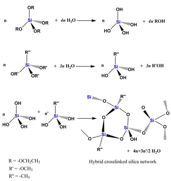 The low cost (economics) and control over the end-product composition are important advantages of the sol–gel process. The silica-based matrices are usually prepared by using tetramethyl orthosilicate (TMOS) or tetraethyl orthosilicate (TEOS), which contains methoxide (-OCH3) and ethoxide (-OC2H5) groups [18,19,20,21] as a primary network-forming agent, allowing for a high degree of control over synthesis conditions, including pH, temperature, and the incorporation of additives. The synthesis of the sol–gel matrices involves hydrolysis and condensation steps in reactions that are outlined in Figure 1. The sol–gel chemistry of silica is typically driven by either acid or base catalysts, as the neutral reaction is very slow. The structure of the resulting gel is significantly different depending on the catalyst, and this is due to the relative rates of the hydrolysis and condensation reactions [22]. Organically modified silica (ORMOSIL) matrices can be prepared by using silane precursors of the type (RO)3Si-R′, where R′ contains the desired substituent [23]. Then, (RO)3Si-R′ is mixed with (OR)4Si, and the matrix is prepared through hydrolysis and condensation stages. The use of precursors of the type (RO)3Si-R′, where R′ has a functional substituent to which a desired compound can be covalently bound or itself has a role in the final matrix network [24,25,26], enables the control of the functionality and hydrophobicity of the matrix obtained [27,28,29]. These materials boast high specific surface areas (SSAs) exceeding facile formation and functionalization, tunable pore structures, and thermal stability [30]. While high-SSA silica has demonstrated functional effectiveness, continued research and development are essential to addressing evolving energy and environmental challenges.