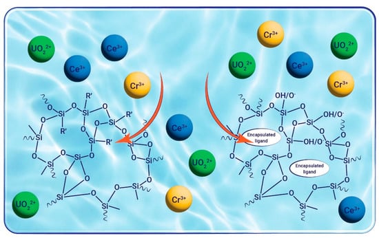 Expanding the sol–gel methodology to prepare gel materials for metal ion extraction necessitates careful consideration of potential perturbations to complexation and, most importantly, the matrix pore structure, surface area, pH, and hydrophobic nature. Variability in pore size and distribution can impact the efficiency of metal absorption, as it may affect the accessibility of metal ions to active sites within the material. Additionally, the formation of large or irregular pores may lead to decreased surface area and reduced metal uptake capacity. Silica gels modified with complexing agents have also proven their effectiveness in extracting metals from aqueous samples [4,51,52,53,54,55]. These silica-based sol–gel materials offer distinct advantages, such as rapid exchange kinetics [4,56] and robust physical stability [57,58], distinguishing them from conventional functionalized resins. The identity of the target heavy metal for extraction dictates the precursors that are used in the matrix preparation. Silane precursors of the type (RO)3Si-R′, where R′ contains the desired substituent that can ligate to metal cations or can be used to bind ligands that are known to be selective to certain metal cations [59,60,61,62,63,64], can be used for the preparation of matrices with higher capacity and selectivity. Alternatively, ligands can be encapsulated in the matrix [65,66] by their addition at different stages of the sol–gel process (Figure 2). This allows for the precise control of both the kind of metal that will be bound and the strength of the binding that affects the regeneration efficiency. The specificity of the entrapment in terms of the target heavy metal cation can be achieved by rationally designing the matrix and taking into account hard and soft acids and bases considerations to enable the separation of metal cations in a common oxidation state.