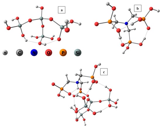 This is an exergonic reaction, indicating that a variety of oxo-acids might be covalently bound to silica sol–gel matrices during their formation. In general, it is evidence that the sol–gel matrix is not inert. Figure 3 presents the structures used for the DFT calculations: the blank silica, the ligand, and the NTPH-entrapped matrix with the new bonds formed.