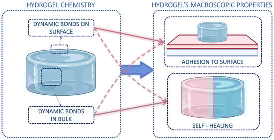 Schematic representation of the correlation between dynamic bonds and the resulting macroscopic characteristics of hydrogels. While the presence of internal dynamic bonds within the hydrogel ensures self-healing (solid line), it does not always allow adhesion to various surfaces (dashed line). Conversely, adhesion is certainly possible when hydrogels can form specific dynamic bonds with certain surfaces, albeit without guaranteeing adequate self-healing. Partially created with BioRender.com, accessed on 22 April 2023.