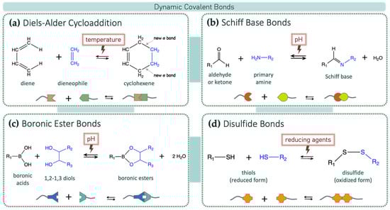 Covalent dynamic bonds are based on different classes of chemical reactions that are briefly described as follows in this section. The principal reactions are both chemically and schematically represented in Figure 2, indicating the specific stimuli to which they are responsive.