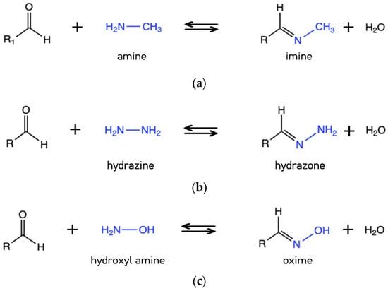 Reversible reactions for the preparation for –C=N compounds: (a) imine, (b) hydrazone, and (c) oxime.