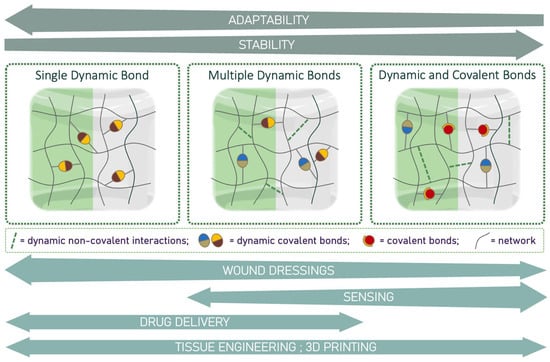 Although these kinds of bonds create very good candidates for stimulus-responsive materials or rapid self-healable systems and offer enhanced properties with respect to single-dynamic-bond hydrogels in terms of stability, they lack of stronger mechanical properties and stability when these characteristics are required.