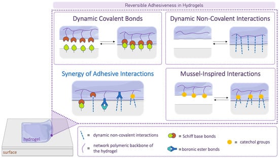 More than often, the bonding dynamicity allows the formation of reversible bonds with the external environment, imparting adhesive properties to the material. This dynamic bonding is key to its adhesiveness, as it allows the hydrogel to repeatedly adhere to and detach from surfaces. However, the self-healing capacity of dynamic hydrogels does not necessarily imply external adhesion, as the internal dynamic processes might not always translate to surface bonding and vice versa. Thus, recent research has focused on designing and fabricating dynamic hydrogels with intrinsic adhesive properties. These advancements enhance their potential applications in fields such as wound healing, TE, cell adhesion, drug delivery systems, and wearable sensors [].