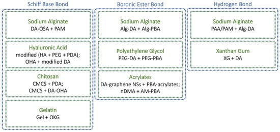 Indeed, a dynamic covalent bond is often accompanied by a dynamic non-covalent one (e.g., H-bonds, hydrophobic interactions, coordination bonds). Inspired by the self-assembly of natural saponin glycyrrhizic acid (GA), which crosslinks by forming H-bonds, a double-dynamic-network hydrogel was developed through a Schiff base reaction between aldehyde-containing GA and the biopolymer CMCS []. H-bonds also cooperated in the chemical structure of a hydrogel made of polyacrylic acid (PAA), PVA, and borax []. The presence of borax allowed the formation of dynamic borate ester bonds, enhancing the hydrogel’s reversible adhesion and improving the cohesion of the two main polymeric components. Being rich in carboxyl groups and hydroxyl groups improves the formation of the non-covalent bonds and the hydrogel’s adhesiveness onto various surfaces. The same couple of bonds was employed to synthetize another adhesive but also conductive hydrogel starting from sodium alginate (Alg), modified with 3-aminophenylboronic acid (3-aminoPBA) and dopamine (DA), respectively []. The formed dynamic boronic ester bond between 3-aminoPBA and DA endowed the hydrogel with a rapid self-healing property.