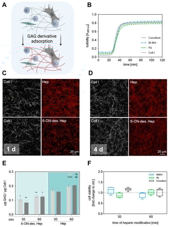 Preparation and characterization of 3D GAG-modified Coll I matrices. (A) Schematic illustration of performed GAG modification of Coll I matrices. To maintain the 3D distribution of both cell types in the network, GAG solutions were applied after Coll I fibrillation was completed. Figure was generated using biorender.com (accessed on 11 June 2024). (B) Turbidity measurement of Coll I fibrillogenesis performed over 120 min at 405 nm with and without cells present in the Coll I solution. (C,D) Representative cLSM images of Coll I matrices showing atto550-labelled variants of heparin and 6-ON-desulfated heparin (red) either 1 d (C) or 4 d (D) after reconstitution. Scale bar 20 µm. (E) Analysis of GAG amount in Coll I matrices 1 d and 4 d after reconstitution using papain digestion (n = 6; data is given as mean ± SE; Tukey’s multiple comparisons test followed by two-way ANOVA; * indicates p ≤ 0.05; ** indicates p ≤ 0.005 between the respective heparin variants; no significant differences between 1 d and 4 d comparison). (F) Analysis of cell viability after 4 d of cell culture exemplarily shown for heparin-modified Coll I matrices after 30 and 60 min of GAG incubation (n = 3, data is not significant after ordinary one-way ANOVA, Box-whisker plots show the 25 and 75 percentile range (box) with Tukey 95% confidence intervals (whiskers) and median values (transversal line); dotted line represents respective Coll I control without GAG modification).