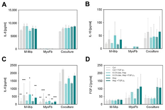 To determine whether the binding of heparin or 6-ON-desulfated heparin affects cellular communication between MyoFb and M-MΦ, we examined both mono- and cocultures after 7 days using a multiplex ELISA assay. Figure 2 shows the levels of four relevant cytokines in the culture supernatant (IL-8, IL-10, IL-6, FGF-2), which are known to be involved in Fb/MyoFb and MΦ cell–cell signaling in wound healing but exhibit quite different characteristics in terms of cellular origin and interaction with sulfated GAGs [,]. From the cytokine profile of the different scaffolds and culture conditions, we found different interaction mechanisms of cytokines with the GAG-modified matrix and a differential impact on cell–cell communication.