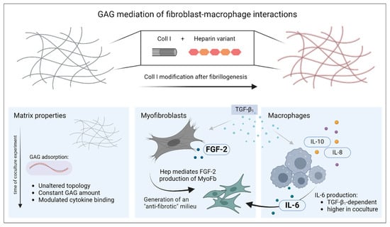 Mediation of fibroblast–macrophage interactions by functionalization of 3D collagen I networks with sulfated glycosaminoglycans. For biomimetic 3D scaffold preparation, modification of Coll I fibrils with GAG variants was performed after fibrillogenesis. The figure describes the changes of the three main components of the culture system over the period of 7 d: Coll I matrix, myofibroblasts and macrophages. The figure was generated using biorender.com (accessed on 11 June 2024).