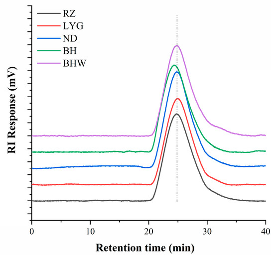 The molecular weight distribution of G. chouae polysaccharides derived from different geographical regions is shown in Figure 1. The retention time and peak shape of the five polysaccharides exhibited remarkable similarity. The molecular weight distribution of G. chouae polysaccharides was considerably high, ranging from 1.85 to 2.09 × 103 kDa. BHW displayed a minimum molecular weight of 1.85 × 103 kDa, while BH demonstrated a maximum molecular weight of 2.09 × 103 kDa. The results showed that the region had little effect on the molecular weight of polysaccharides from G. chouae. Despite the fact that a higher molecular weight of polysaccharides leads to increased rheological properties (higher values of G′ and G″) [21], the difference in molecular weight might not be regarded as the primary determinant contributing to the disparity in rheological properties of G. chouae polysaccharides due to its negligible magnitude.