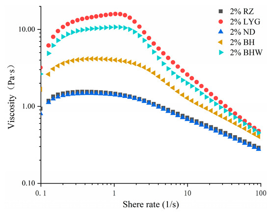 The variation in apparent viscosity is indicative of changes in intermolecular forces, with a higher apparent viscosity corresponding to stronger molecular attractive forces [22]. The flow curves depicting the relationship between apparent viscosity and shear rate are presented in Figure 2. The observed samples exhibited typical shear thinning behavior, characterized by a gradual decrease in apparent viscosity with increasing shear rates (from 0.1 to 100 s−1). The observed phenomenon can be ascribed to a reduction in intermolecular interactions among neighboring polymer chains or structural degradation [23]. When the shear rate was 10 s−1, the apparent viscosity of LYG polysaccharide exhibited the highest value, while that of ND polysaccharide showed the lowest value at equivalent concentration levels. The viscosity values of G. chouae polysaccharides at a shear rate of 10 s−1 are presented in Table 3. Among the five G. chouae polysaccharides, LYG and BHW polysaccharides demonstrated relatively elevated viscosities, primarily attributed to their higher anhydrogalactose content. The difference in apparent viscosity of G. chouae polysaccharides may primarily stem from variations in anhydrogalactose content, as evidenced by the consistent correlation observed between these two factors when considering their chemical composition.