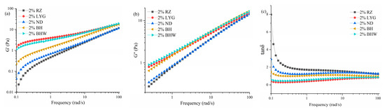 Rheological properties of G. chouae polysaccharides. ((a) Storage modulus, (b) loss modulus, (c) tanδ).