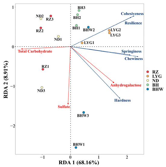 Redundancy analysis (RDA) was an alternative to canonical correlation analysis [34]. The RDA-based approach exhibits a superior combination of low false-positive and high true-positive rates compared to generalized linear models or latent factor mixed models [35]. In this study, the RDA was conducted to further investigate the correlations between chemical compositions and TPA characteristics. As shown in Figure 4, the angle between all TPA characteristics and anhydrogalactose content was acute, indicating a positive correlation. Among these TPA characteristics, the angle between hardness and anhydrogalactose exhibited the smallest value, indicating that anhydrogalactose predominantly influences gel strength. On the contrary, the angle between all TPA characteristics and total carbohydrate content was obtuse, suggesting a discernible negative correlation. As previously mentioned in the chemical composition, a higher total sugar content corresponds to a lower concentration of anhydrogalactose, which exhibits relatively weak color rendering properties compared to other monosaccharides. Consequently, the anhydrogalactose content played a pivotal role in determining the gel’s distinctive features. The sulfate content exhibited a negative correlation with the cohesiveness and resilience of the G. chouae polysaccharides. This could be attributed to the inverse relationship between the sulfuric acid group and the mass proportion of the sugar chain, resulting in a reduced number of polysaccharide molecules available for functioning at equivalent masses. Furthermore, both the position and quantity of sulfuric acid groups directly influence the colloidal properties of red algae-derived polysaccharides. For instance, the absence of trivalent ions poses a challenge to achieving gel formation with lambda-carrageenan, which carries three sulfuryl groups attached to every two galactose units [36].