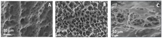 Tensile strength–strain curves were obtained from 40 mm × 10 mm strips by an INSTRON testing machine 5900R with a 1 N load cell at room temperature and 1 mm min−1 crosshead speed. Three independent samples were used for each set of hydrogels. The stress σ and the strain ε were calculated as reported in literature [] and described in the Supplementary Materials.