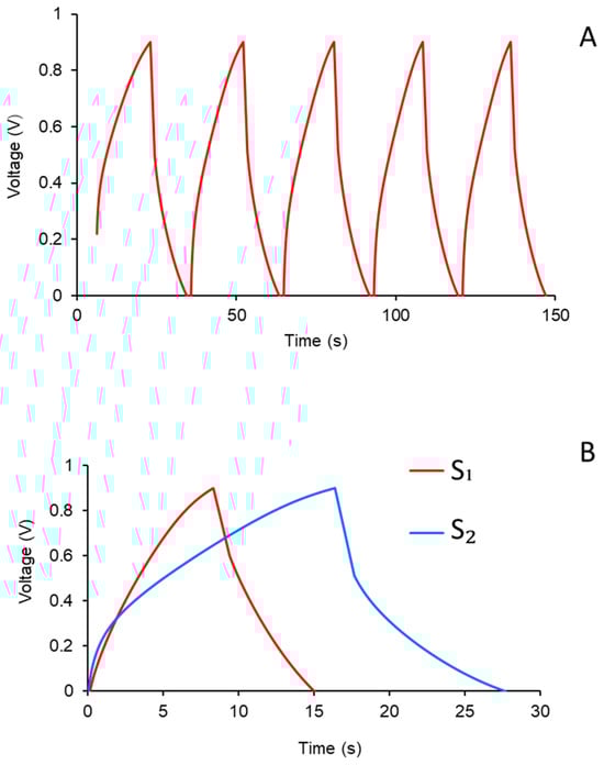 The parameter that most effectively assesses the functionality of the SC devices is the specific capacitance (Cp). The semi-cell Cp values have been obtained from galvanostatic charge–discharge (GCD) tests conducted for each semi-cell, at a constant current density of 0.025 mA cm−2 within the potential window between 0.00 and 0.90 V vs. SCE (saturated calomel electrode) for five cycles totals. Subsequently, by Equation (2), specific capacitance was calculated as described in Table 3. Figure 2 reported, as an example, the GCD measurements of S1 (Figure 2A) and the comparison of the third GCD cycle between S1 and S2 (Figure 2B).