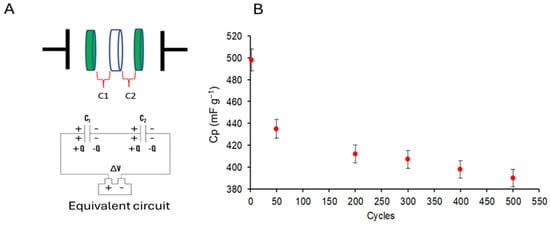 Hy2SC, obtained from PVA with a molecular weight of 89,000–98,000, resulted in the most efficient charge accumulation at the interface and showed a higher Cp value. In Figure 3B, the trend of specific capacities is calculated on consecutive cycles. After 500 cycles, the specific capacitance reached a value corresponding to 78% of the initial capacitance.
