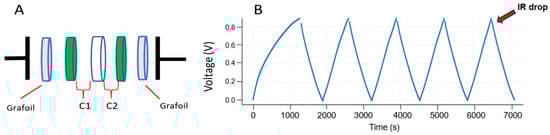 An alternative to the previous cell has been assembled using two flexible current Grafoil collectors on the external sides of electronic layers. Preliminary tests have been conducted by interposing two 3.0 mm diameter Grafoil disks between the symmetric cell and the Swagelok-type electrodes (Figure 4A). The Grafoil allowed us to increase the Cp values of the symmetric cells (Table 4) and to decrease the IR drop in the GCD curves (Figure 4B).