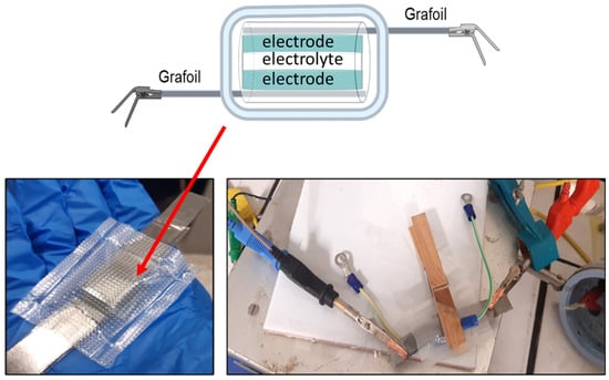 The Grafoil acted as a flexible current collector due to its high conductivity. The assembled system was first covered with a transparent inert adhesive tape to enhance adhesion between the layers; finally, it was sealed inside a transparent LDPE (low density-polyethylene) film.
