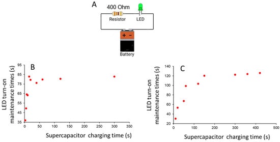 (A) Equivalent circuit for LED power on; (B) LED turn-on maintenance time vs. supercapacitor charging time curve obtained with three supercapacitors in series one after the other configuration; (C) LED turn-on maintenance time vs. supercapacitor charging time curve with three supercapacitors in series in overlapped configuration.