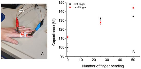 (A) Digital image of flexible Hy2SC attached to a resting finger and subjected to bending; (B) variation of the percentage capacitance of Hy2SC before and after 25 and 50 repetitive and consecutive bending stimuli on a finger. Data were obtained in triplicate from three different samples.