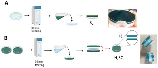 To obtain the double-layer hydrogel semi-cell (Sx: Hyx-PANI_PAMPSA/Hyx), a layer of Hyx (electrolyte) solution was first poured into a Petri dish of 8 cm diameter and subjected to 30 min of freezing. Afterward, a Hyx-PANI_PAMPSA solution layer (electrode) was deposited on the top of Hyx (Scheme 2A). Finally, the double-layer hydrogel configuration was subjected to 6 freeze–thaw cycles. The amount of conductive polymer inside the hydrogel layer is 0.023 g. A symmetric HyxSC was assembled following the procedures previously described. In specific, three hydrogel solutions were prepared in three different flasks, one containing only PVA-H2SO4 and two also containing the PANI_PAMPSA. The two Petri dishes containing the Hyx-PANI_PAMPSA were placed in the freezer at −18 °C for 30 min to ensure a semi-solid consistency. Then, without waiting for its thawing, the electrolyte solution (Hyx), kept at room temperature, was poured onto the layer of Hyx-PANI_PAMPSA prepared before. Finally, the second layer of Hyx-PANI_PAMPSA was gently overlapped as shown in Scheme 2B. After 6 freeze–thaw cycles, the final compact integrated system (HyxSC) was obtained.