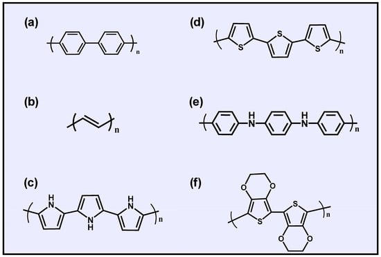 Owing to advantages such as flexibility, easy synthesis, cost-effectiveness, and electrical and optical properties, conducting polymers (CPs) resemble metals and semiconductors. Furthermore, the physicochemical characteristics of CPs can be tunable by surface functionalization or doping approaches []. The different families of functional CPs are known as poly(p-phenylene), polyacetylene, polypyrrole (PPy), polythiophene (pTh), polyaniline (PANI), and polyethylene dioxythiophene (PEDOT) (Figure 1) [,].
