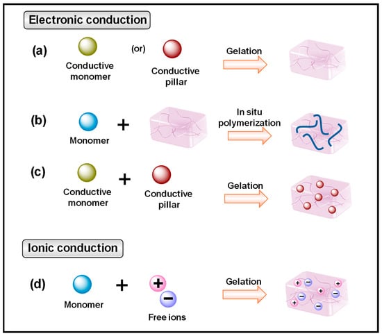 Conductive hydrogel fabrication and conductive mechanisms. (a) Direct gelation of conductive materials as cross-linking monomers, (b) suspending conductive materials within the hydrogel network, (c) in situ polymerization within a prepolymer hydrogel matrix, and (d) introduction of conductive ionic compounds.