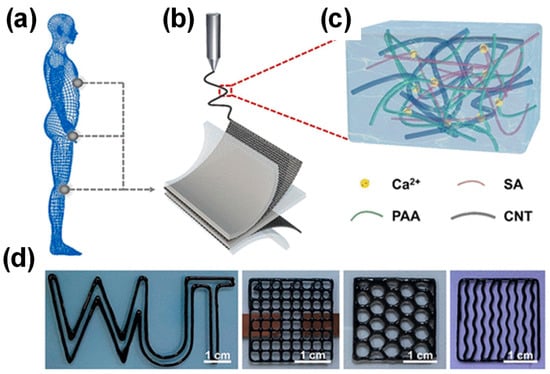 Fabrication of Ca-PAA-SA-CNT hydrogel-based strain sensor. (a) Human body movement sensing; (b) Ca-PAA-SA-CNT preparation by printing process; (c) prepared Ca-PAA-SA-CNTs HGs; (d) different 3D-printed patterns. Reprinted with permission from Ref. [].