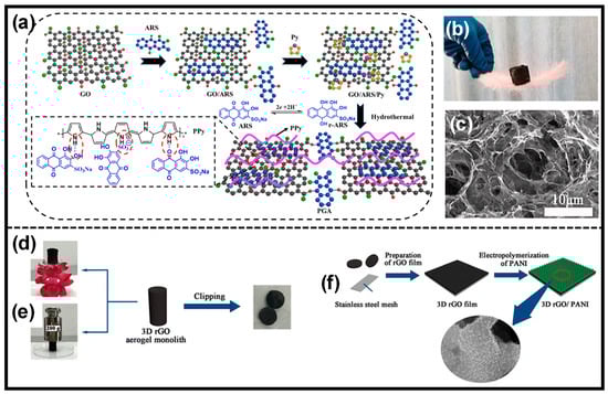 (a) Preparation method of rGO/PPy nanocomposite aerogel. The symbol (*) depicts the continuous attachment of the participating monomeric units. (b) Photo image of rGO/PPy composite aerogel standing on a feather. (c) SEM image of rGO/PPy composite aerogel. Reprinted with permission from Ref. [] (Copyright 2022, Elsevier). (d,e) Mechanical properties of 3D rGO aerogel. (f) Preparation of PANI/rGO composite aerogel by electropolymerization. Reprinted with permission from Ref. [] (Copyright 2017, Springer).