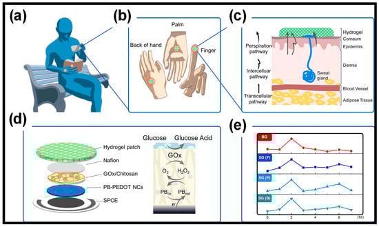 (a) The hydrogel patch is versatile, allowing for sweat sampling at various locations during periods of rest. (b) It can be placed on the finger, palm, or back of the hand for efficient sweat collection. (c) It utilizes preferential glucose pathways to sample sweat naturally through the hydrogel patches. (d) The sweat glucose sensor features a multi-layered enzymatic PB-PEDOT NC electrode and operates with a GOx mechanism alongside a PB probe. (e) This device is capable of monitoring sweat glucose levels without the need for high-intensity activity or external stimuli, at various sites including the finger (F), palm (P), and back of the hand (B). Reprinted with permission from Ref. [] (Copyright 2022, Elsevier).
