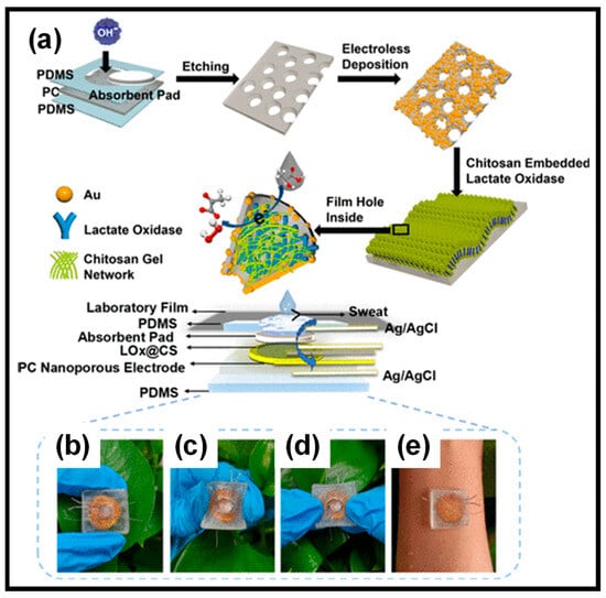 Commonly, lactase oxidase (LOx) is the main enzyme used in the wearable sweat lactate sensors that were reported []. Wu et al. [] described a WEBS that featured gold nanoelectrode arrays on a nanoporous polycarbonate (PC) membrane (Figure 8). This sensor, which encapsulates LOx within a chitosan (CS) hydrogel, can simultaneously detect body temperature and sweat lactate levels. The nanoporous electrode significantly reduces resistance and offers nanoconfined spaces that enhance the LOx catalytic reaction. It also limits substrate concentration on the surface, minimizing substrate inhibition, which leads to a wider detection range and greater selectivity.