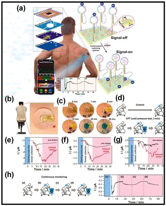 (a) Depiction of a wearable sweat patch designed for cortisol level monitoring. This device integrates a microfluidic system with an electrochemical sensor that captures, processes, and instantaneously detects cortisol levels. It employs a conformation-switching aptamer featuring a pseudoknot structure. The measured cortisol concentrations and sweat pH levels can be wirelessly transmitted for visualization and analysis to an adjacent smart device, and measurement of on-body signal regeneration (a–d). (b) Application of the sweat patch on the lower neck of participants during trials. (c) Photographs of the microfluidic reservoir filling with sweat during physical activity, with blue dye added to each inlet for visual confirmation. (d) Test protocol, including control and stress induction phases. (e–g) Continuous monitoring of sweat from three distinct individuals. (h) Long-term continuous monitoring, (h-a) Initial period of exercise, (h-b) Rapid increase after sweat fills the reservoir, (h-c) Subsequent restoration to a normal level in 7–8 minutes, (h-d) Stress was induced by a cold pressure test, corresponding measurement of on-body signal regeneration (a–d). Reprinted with permission from Ref. [] (Copyright 2023, Elsevier).