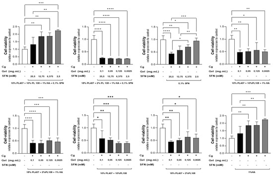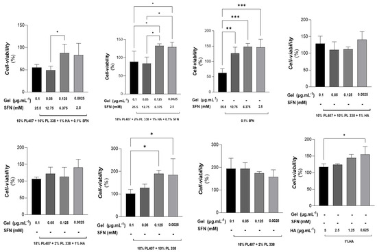 For both assays, this study used SFN and control group formulations that had the same serial dilution. The initial concentration for SFN formulations was 56 mM, and cells were treated in a concentration interval from 2.5 to 25.5 mM. The initial concentration of PL and HA in control groups was 0.2 µg·mL−1 and 10 mg·mL−1, respectively. The PL concentrations ranged from 0.1 to 0.0125 µg·mL−1; while HA concentrations ranged from 5 to 0.625 mg·mL−1. We performed intra- and intergroup comparisons to evaluate differences between the four tested concentrations and between the total of eight groups, respectively.