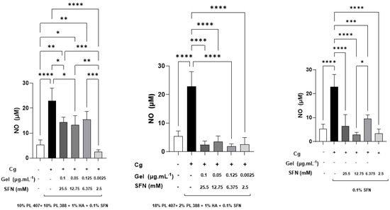 The in-vitro assay also showed that our formulations were able to reduce NO production. By itself, SFN reduces iNO expressions and inhibits NO production. These effects relate to its modulating effect on NF-κB and Nrf2 pathways [1,16]. In our study, we found that F2 reduced NO production more than F1 and F3. In this sense, it seems that the use of hydrogels enhances SFN’s anti-inflammatory activity.
