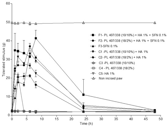 F2 (PL 407/338 (18/2%) + HA 1% + SFN 0.1%) showed an increase in the tolerated stimuli over time (Figure 5) in almost all periods of evaluation. After 1, 2, and 4 h, F2 presented a higher mean value of tolerated stimulus when compared to the other formulations (p < 0.001). Six hours after the injections, F1, F2, and F3 all showed similar effects. Nevertheless, after 8 and 24 h, we once again observed an increase in the tolerated stimuli in animals treated with F2, when compared to groups that received other formulations (p < 0.001). This demonstrates the slow release of SFN when administered with these polymer combinations. After 48 h, none of the tested formulations presented analgesic effects. Table 1 shows these results, considering the tolerated stimuli over time.
