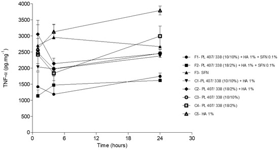 TNF-α levels in plantar tissue 1, 4, and 24 h after injection of SFN and control group formulations. Statistical analysis ANOVA/Tuckey-Kramer: F1 and F2 < F3 after 1 (p < 0.05), 4 (p < 0.01) and 24 h (p < 0.05). F1 and F2 < C5 after 1 (p < 0.05), 4 (p < 0.01) and 24 (p < 0.001).