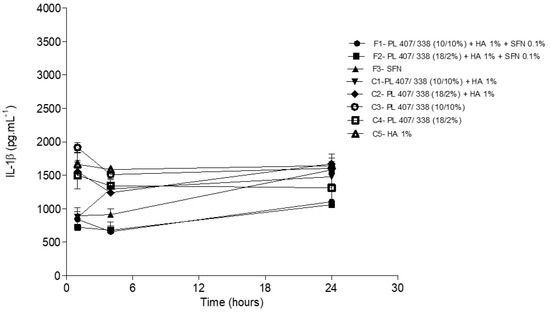 Similarly to what was reported in the previously discussed studies [18,19,20,21,23], we observed that SFN’s antinociceptive effect was related to lower levels of TNF-α and IL-1β. These effects were more intense in formulations using hydrogels and are probably related to these systems’ ability to inhibit COX-2. The formulations’ ability to inhibit COX-2 was established in our group’s previous research using in-vitro experiments [1]. When compared to the control groups and isolated SFN (F3), SFN hydrogels (F1 and F2) reduced TNF-α levels 1, 4, and 24 h after the intramuscular injections (p < 0.05) (Figure 5). Concerning IL-1β levels, we observed significant differences between F1, F2, and F3 when compared to C5 after 1 and 4 h (p < 0.05) (Figure 6). Twenty-four hours after the injections were administered, there were no significant differences in IL-1β levels among the groups