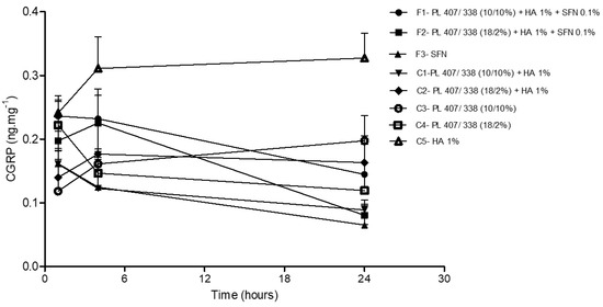 CGRP levels in plantar tissue 1, 4, and 24 h after SFN formulations and control group injections. Statistical analysis ANOVA/Tuckey-Kramer: F1, F2 and F3 < F8 after 24 h (p < 0.05).
