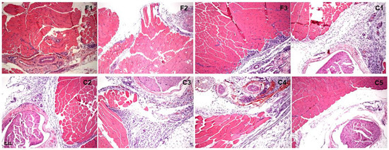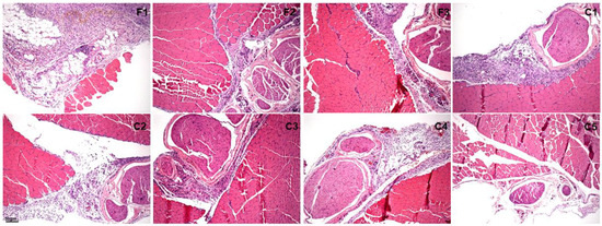 Figure 8 and Figure 9 display cross-sections of the injection site (intramuscular administration) and surrounding soft tissues 2 and 7 days after injection of the tested formulations and their respective control groups. Two days after administration, there were no significant differences among all tested formulations and the injections received by the control groups (p < 0.05, Figure 9 and Table 2). However, C3 induced higher inflammatory reaction scores than F1, F2, F3, and C5 (p < 0.05). After 7 days, C5 promoted lower inflammatory reaction scores than F1, C1, and C3 (p < 0.05).