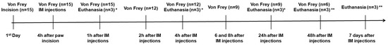 Regarding experimental procedures, we first placed animals in clear plastic cages with elevated wire mesh floors and recorded their basal withdrawal responses to the von Frey anesthesiometer (Ugo Basile, Varese, Italy). The withdrawal response consists of the animals’ elevation of their paw when experimenters probed the plantar region with a growing pressure, measured in grams. Next, we induced anesthesia with a sevoflurane-soaked gauze at the bottom of a 50 mL Falcon® tube placed over the animals’ muzzles for 10 to 15 s [13,17,25].