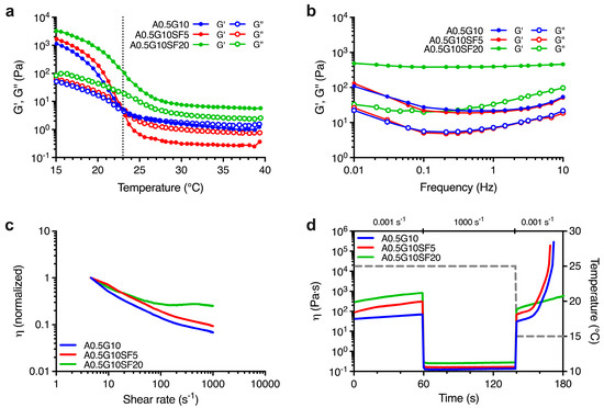 First, we characterized the rheological profiles of the blends. To achieve this, we had to take into account that gelatin is a thermoresponsive polymer. Therefore, we first performed a series of temperature sweep experiments. We designed the experiment to investigate the viscoelastic behavior as a function of temperature ranging from T = 40 °C to T = 15 °C for all the three bioink formulations. From the results reported in Figure 1a, we can conclude that the A0.5G10 and A0.5G10SF5 bioinks exhibited a liquid-like behavior (i.e., G″ > G′) at 40 °C. As temperature decreased, the crossover point of G′ and G″ was reached (at 23 °C for A0.5G10 and A0.5G10SF5) and thereafter the bioinks began to exhibit gel-like properties (i.e., G′ > G″). Otherwise, the A0.5G10SF20 bioink retained its gel-like properties over the entire temperature range studied. To further investigate the temperature-dependent behavior of the blends, frequency sweep experiments were performed at 25 °C. For bioinks with gel-like behavior, G′ predominates over G″, while the opposite is true for viscoelastic fluids [11]. Strikingly, the frequency sweep tests revealed a gel-like behavior for all the bioinks (Figure 1b).