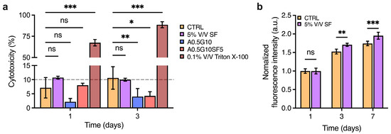 Before proceeding to bioprint cells encapsulated in the bioinks, we wanted to assess the potentially cytotoxic effect of the SF solution and the formulated bioinks. To do so, MG-63 cells were incubated with either SF or the hydrogels for 3 days, and then a lactate dehydrogenase (LDH)-release assay was performed to assess damage to cell membranes. More specifically, the SF solution was diluted to 5% V/V in complete DMEM High-Glucose medium, and then, the release of LDH was compared to that of the control (complete DMEM High-Glucose medium, untreated). Similarly, A0.5G10 and A0.5G10SF5 hydrogels were placed over MG-63 cells and their LDH release compared to the controls. As shown in Figure 4a, results from the LDH-release assay confirm the absence of cytotoxic effect on eukaryotic cells for both SF and the hydrogels. Of note, the final concentration of SF in the medium was 0.02 mg/mL, equating to the concentration inside the bioink. Then, inspired by other studies reporting the growth-promoting properties of SF [40,41], we decided to investigate the pro-proliferative potential of SF added to the cell culture medium. An AlamarBlue assay was performed on cells incubated with SF 5% V/V after 1, 3, and 7 days of incubation (Figure 4b). Their proliferation was compared with that of cells incubated under standard conditions (i.e., complete DMEM High-Glucose medium). Strikingly, the proliferation increased from day 3. It is has been already reported that SF promotes wound healing by enhancing the proliferation of fibroblasts [42]. Xie et al. reported that SF could trigger activation of the extracellular signal-regulated kinase (ERK) signaling pathway, leading to an increase in growth [43].