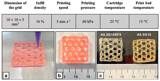 (Upper table) Parameters used for the 3D bioprinting of MG-63 cells using A0.5G10 and A0.5G10SF5 bioink formulations. (Bottom panel) Representative images of 3D-bioprinted structures (20 × 20 × 3 mm3, honeycomb pattern) produced with the A0.5G10SF5 bioink formulation. (a) Bioprinting of the 3D structure and (b) final result (not crosslinked). (c) Comparison of the A0.5G10SF5 3D structure with its SF-free counterpart after irradiation with visible light.