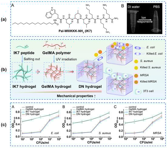 - Tan, T.; Hou, Y.; Zhang, Y.; Wang, B. Double-Network Hydrogel with Strengthened Mechanical Property for Controllable Release of Antibacterial Peptide. Biomacromolecules 2024, 25, 1850–1860. [Google Scholar] [CrossRef] [PubMed]