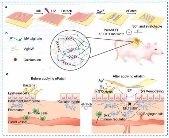 - Wang, C.R.; Jiang, X.; Kim, H.J.; Zhang, S.M.; Zhou, X.W.; Chen, Y.; Ling, H.A.; Xue, Y.M.; Chen, Z.W.; Qu, M.Y.; et al. Flexible patch with printable and antibacterial conductive hydrogel electrodes for accelerated wound healing. Biomaterials 2022, 285, 121479. [Google Scholar] [CrossRef] [PubMed]
