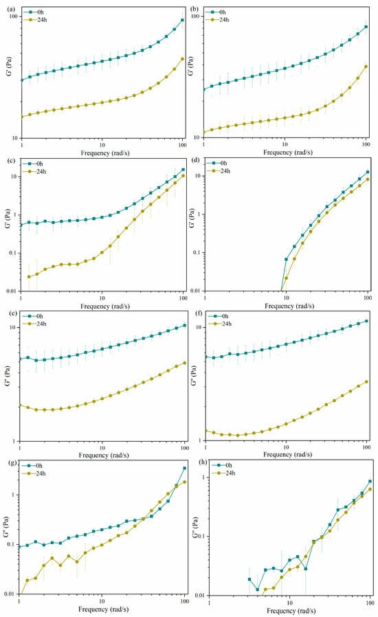 Rheological properties of fermentation medium: (a–d) storage modulus of carrageenan (C107615), κ-carrageenan, ι-carrageenan, and λ-carrageenan, respectively; (e–h) loss modulus of carrageenan (C107615), κ-carrageenan, ι-carrageenan, and λ-carrageenan, respectively.