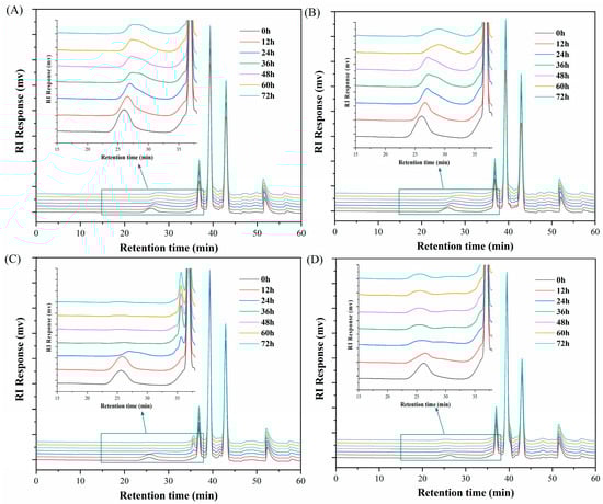 The molecular weight distribution of fermentation medium: (A) carrageenan (C107615), (B) κ-carrageenan, (C) ι-carrageenan, (D) λ-carrageenan.